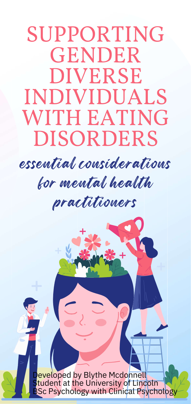 Supporting Gender Diverse Individuals with Eating Disorders Supporting Gender Diverse Individuals with Eating DisordersEssential considerations for mental health practitioners. To view or to download, click the image below. Developed by Kelly Rosemin Student at the University of Lincoln BSc Psychology with Forensic Psychology Megan2024-09-11T10:04:55+00:00September 11th, 2024|EDI, News, Research, Resources, Services|